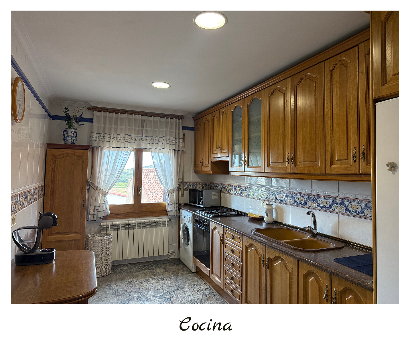 Cocina con horno, microondas, menaje, tostadora y cafetera